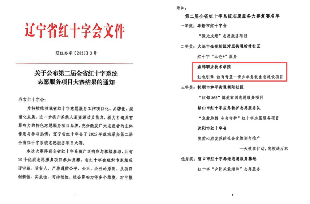 近日,第二届辽宁省红十字系统志愿服务项目大赛获奖结果正式揭晓。本次大赛自去年5月份启动,我校团委积极准备项目申报材料,最终,我校红十字会“红色引擎 教‘育’青蓝——青少年急救生态建设项目”凭借扎实的项目内容、完备的运行体系和良好的实践成效,在全省众多参评项目中脱颖而出,荣获大赛二等奖。